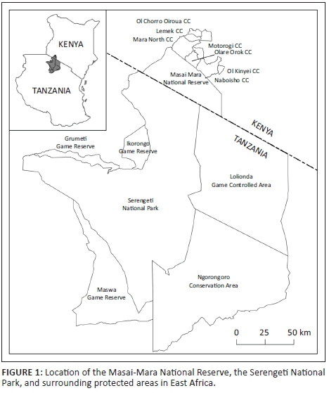 The Serengeti-Mara ecosystem is a trans-border area that covers ± 100 000 km2 in the northwest of Tanzania and southwest of Kenya (Figure 1). The core conservation areas consist of the Masai-Mara National Reserve in Kenya which covers ± 1500 km2, while the Serengeti National Park in Tanzania covers 14 750 km2. Both of these protected areas are surrounded by buffer zones such as inner and outer group ranches or conservancies in Kenya and the Ngorongoro Conservation Area, Loliondo Game Controlled Area and the Maswa, Grumeti and Ikorongo Game Reserves in Tanzania. The area has varied vegetation and topography, including savanna, grassland, riverine forests, inselbergs (characteristic rock outcrops which rise suddenly above a plain) and wetlands. The mean annual rainfall is around 1000 mm, ranging from 508 mm on the plains to 1200 mm near Lake Victoria in the west, with a short rainy season in October and November and a longer rainy season from March to May. The ecosystem is well known for the migration of 2 million animals (mainly wildebeest, zebras and gazelles), which range between the Serengeti National Park and surrounding conservation areas and the Masai-Mara National Reserve and the adjoining conservancies, and the area is an important tourist destination. The area has a relatively large number of tourist roads and tracks, especially in the Masai-Mara National Reserve, and several lodges have been built, starting in the 1960s; these lodges and other tourist facilities, such as camping sites, can accommodate thousands of tourists, and many more staff and community members reside permanently within the ecosystem.