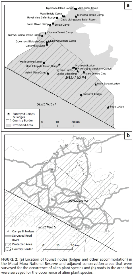 Tourist facilities in protected areas can be an important source of invasive alien species. For example, Foxcroft, Richardson and Wilson (2008) surveyed 36 tourist camps and staff villages in the Kruger National Park, South Africa, and identified 258 alien plant species, several of which subsequently became important invaders of the surrounding ecosystem. We therefore surveyed the grounds of 24 tourist facilities (lodges or other accommodation sites, which often included relatively large, fenced grounds covered by natural vegetation) in the Masai-Mara National Reserve (Figure 2). We noted all alien plant species present, and recorded whether the species had established naturalised populations within the tourism facilities and whether they had become invasive. Species were regarded as naturalised if they were considered to have been reproducing consistently, sustaining populations over many life cycles without direct intervention by humans (Richardson et al. 2000). Species were recorded as invasive if they were found to be spreading beyond the fences or outside of the tourism facilities or other human habitation.