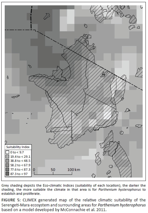 Overall, our extensive roadside surveys revealed that the Serengeti-Mara ecosystem is currently relatively free of transforming invasive alien plants, with the exception of relatively small localised populations of L. camara, T. diversifolia, O. stricta, Opuntia ficus-indica, and O. monacantha, with more extensive and widespread infestations of P. hysterophorus in the Masai-Mara National Reserve and adjoining conservancies (Figure 4). Unless they are managed, these infestations are likely to expand, as the results of our second survey on P. hysterophorus in 2016 clearly demonstrated. This is very likely considering that climate suitability maps, developed by Kriticos et al. (2015) and McConnachie et al. (2011), indicate that most of the Serengeti-Mara ecosystem is climatically suitable for the establishment of P. hysterophorus, especially the northwestern section (Figure 5). Other invasive plant species such as C. odorata and Prosopis juliflora, which are currently abundant outside of the ecosystem, within predominantly communal lands to the west (Figure 4), are also likely to spread into the ecosystem in the foreseeable future, if steps are not taken to prevent this.