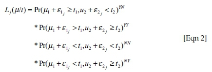 Φε1ε2 is the standardised bivariate normal distribution function with zero means; y1j =1 if the response to the first question is yes and 0 otherwise