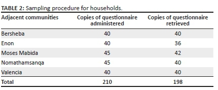The study employed a two-stage sampling technique to identify 198 households as presented in Table 2. In the first stage, the names of eight villages adjacent to the AENP were retrieved from SANParks with which authors signed a contractual agreement. From these eight villages, five villages adjacent to the PA were selected using simple random sampling, which is a probability sampling method. The second stage involved non-probability convenience sampling of households that are willing to participate in the study from the selected villages. The choice of the convenience sampling method was informed by non-availability of sampling frame from which random sample can be drawn for the study. Five enumerators from the five selected communities were recruited through the assistance of MNDT, and the enumerators were trained by the researcher on how to administer the questionnaire to the respondents in their local language to ensure a clear understanding of the study. The data were collected in March 2016.