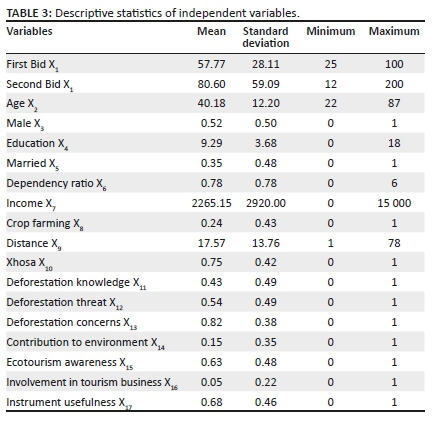 Furthermore, the mean distance of household's residence to the AENP is 17.57 km. The fact that respondents live a mere 17 km away from the PA suggests that they may be familiar enough with the PA in order to value it. Studies have also shown that the proximity to a resource, the more the WTP for it (Biadgilign et al. 2015). A monthly income of R2265.15 was reported as the mean monthly income in the study. This mean monthly income is comparatively lower than the average annual income of R6400.00 for the Eastern Cape Province, as reported in Statistics South Africa, 2012. However, we believe that this figure is commensurate with the level of education reported by the respondents in the study area. Regarding the six variables measuring respondents' knowledge of deforestation, deforestation to the AENP, concerns about deforestation, contribution to environmental cause, awareness of ecotourism and involvement in tourism-related business, 43%, 54%, 82%, 15%, 63% and 5%, respectively, were affirmative to these questions. When asked about the usefulness of the information provided in the questionnaire for the respondents to make decisions, 68% affirmed that the questionnaire was useful.