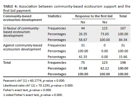 To establish zero WTP amongst the study participants, they were first asked whether or not they would favour CBE if funding was made available from either government or non-governmental organisations (NGOs). As indicated in Table 4, about 84% of the respondents indicated that they would favour the CBE project if money is made available by the government and/or NGOs. Amongst the respondents that support the project, about 73% were affirmative in their response to the first bid. Of the 15.6% that were against the CBE project, all responded negatively to the first WTP question. Correlation test results presented in Table 4 reject the null hypothesis that whether respondents would favour CBE development is independent of their responses to the first WTP question at 1% level of significance. It invariably implies that household's response to the first WTP question is strongly associated with either they are in favour or against the implementation of the CBE project.