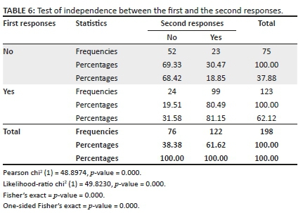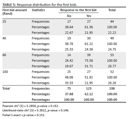 Distribution of respondents' responses to the first bid and the results testing the null hypothesis that the responses are independent of the first -bid amount in Rand is presented in Table 5. The null hypothesis is strongly rejected at 1% level of significance. This means that respondents take into account the bid amounts when stating their WTP. The first three rows in Table 5 describe each bid level. The first row corresponds to the frequency of 'no' and 'yes' answers to the specified bid amount in Rand and to the total number of the respondents who were exposed to that bid amount. The second row represents the percentage of 'no' and 'yes' responses amongst those who were offered the bid amount. The third row indicates the percentage of respondents who indicated 'no' and 'yes' for that particular bid across all respondents that were offered the bid.