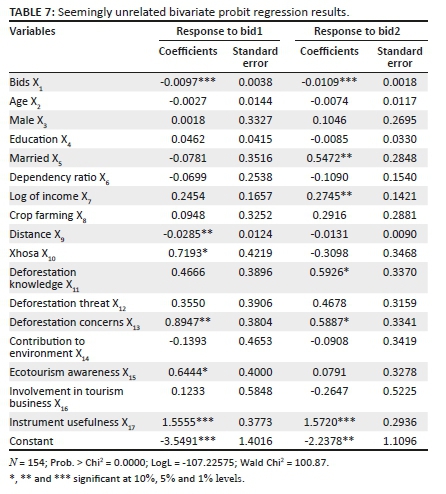 The results of the seemingly unrelated bivariate probit model showing the summary statistics of coefficients, standard errors and levels of significance for first and second responses are presented in Table 7. When implementing the model, we assumed that the same exogenous variables appear in both equations because there are no requirements that different variables should appear in the two equations (Green 2018). The conditional tetrachoric correlation (r) of the error terms (Green 2018) capturing the correlation between the binary variables (responses to first and second bids) of 11.70 indicates that there is a correlation between the binary variables. Of all the 17 variables included in the bivariate probit model, the first bid: residents' distance to the AENP, Xhosa, deforestation concerns, ecotourism awareness and instrument usefulness are significant in the first equation. Whilst, that of second bid: being married, log of income, deforestation knowledge, deforestation concerns and instrument usefulness are significant in the second equation.