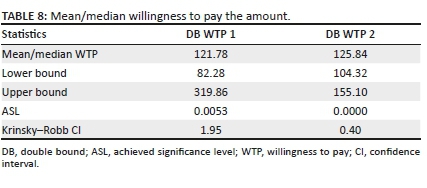 The distribution of the average WTP estimates, the lower and upper bound parameters from the DBCV, achieved significance level, confidence intervals using Krinsky and Robb procedures are presented in Table 8. The confidence intervals reported in this study were estimated with 50 000 draws as recommended by Krinsky and Robb (1986) and Park, Loomis and Creel (1991). In computing mean/median WTP, mean income from survey data is used. In the first instance, it was observed that the estimated mean/median WTP increased from R121.78 to R125.84 when the second question was introduced. This is a counterintuitive result of the double bounded modelling. The variation in the binary responses conveys information about the error in each equation because the bid amounts vary across individuals. The results of this study imply that the actual 'willingness to pay' of the respondents in communities adjacent to the PAs in the study area may be lower than the amount estimated by the DBCV. Therefore, further study may be required to empirically clarify this.