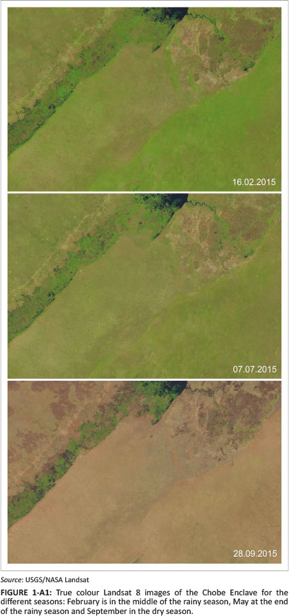 The floodplains are under the influence of two major river systems: the Linyanti (called Kwando in its upstream part) and the Zambezi. The Zambezi inflows push water back into the Chobe River, as far back as the CE (Pricope 2013). These rivers originate in Angolan highlands, 750 km further north. The amount of precipitations in both basins during the wet season controls the intensity of flooding and water table levels. Peak of flood pulses of both systems occur at different seasons: March-April for the Zambezi and June-July for the Linyanti (Pricope 2013). These flood peaks correspond to the end of the rainy season and dry season, respectively. Similar dynamics are observed in the Okavango Delta, where timing and duration of seasonal flooding are one of the important factors determining vegetation composition (Murray-Hudson et al. 2011). Seasonal flooding creates a zonation from permanent water (Lake Liambezi in the north) to areas with irregular flooding only. As stated above, our data set in the wetlands is insufficient to completely translate the diversity of plant communities. Supplementary data would allow the subdivision of the wet floodplains in various plant communities, as observed in the Okavango Delta (Murray-Hudson et al. 2011). A better description of these floodplains would be especially necessary as they are highly important for water and fodder availability to the wildlife during the dry season, with the gradient of flooding corresponding to variations in foraging time (Fynn et al. 2015).