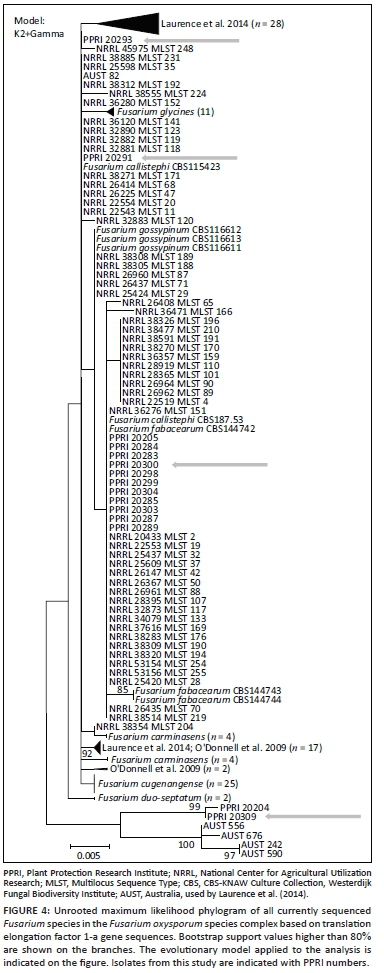 The majority of strains (90) obtained from the KNP sample sites belonged to F. chlamydosporum species complex. A four-locus typing scheme (O'Donnell et al. 2009b) revealed MLST and species within the species complex, and Lombard et al. (2019a) recently published the description of numerous new species in the complex. Isolates obtained from this study appear to represent new species. As before, a number of new species from the KNP are yet to be described.