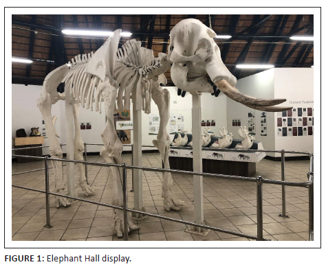 The KNP, which is the focus of this study, is the largest national park managed by SANParks and it is considered to be the flagship park of the country, attracting over 1.8 million visitors annually, prior to the COVID-19 lockdown in 2020 (SANParks 2020:113). Ecotourism services are a major pillar of economic activity for the KNP, but Engelbrecht, Kruger and Saayman (2014) found that there was a gap between what the visitors to the KNP expect and what they experience in terms of interpretation and education activities (part of interpretation); thus, the core element of ecotourism, namely education is seemingly overlooked. This is a dilemma, as interpretation is seen as less important in the strategic plan for commercialisation, which forms a significant part of ecotourism services. Planning for interpretation is therefore not considered to be a priority in SANParks and especially not in the KNP, although it is home to a number of museums, both cultural and natural. A thorough study is required of the services offered by these interpretation facilities in order to enhance the overall service experience of visitors. One of the largest of these museums is the Letaba Elephant Hall, located in the Letaba rest camp in the centre of the reserve. The Letaba Elephant Hall houses a number of exhibits associated with elephants, including information on elephant evolution, behaviour, human-elephant relations, a full skeleton, multiple skulls and tusks of some of the largest tuskers that have lived in the KNP, and other displays that promote elephant conservation. Figure 1 depicts one of the displays in this museum.