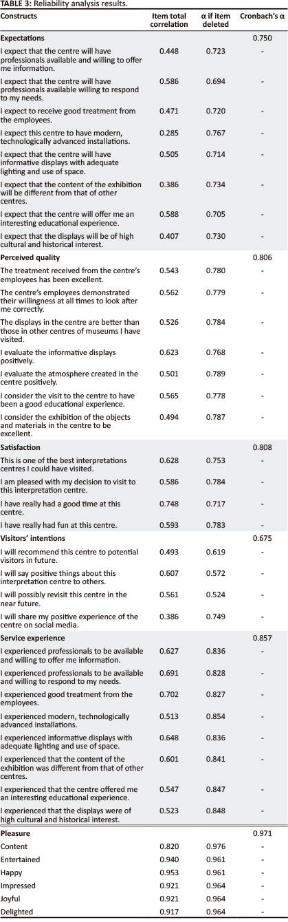 In Table 2, the percentages for item measures are presented. The subscale visitors' expectations had a total of eight items, where all the items had a mean above 3.5 with a minimum mean of 3.63 and a maximum of 4.45. This shows that the responses regarding the expectations skewed positively. This is also confirmed by the frequencies percentage where higher proportions were towards agree and strongly agree. Perceived quality was evaluated on the subscale of seven items. The mean for the perceived quality was 4.26 with a SD of 0.187. The same picture for positively perceived quality about the Letaba Elephant Hall is seen by the percentages, which lean closely to agree and strongly agree. Similarly, the calculated means on the satisfaction subscale were above 4 with notable percentages of above 70% (agree and strongly agree) obtained in all four items. Visitors' intentions and the service experience show the same picture as the other subscales. Their observed means were notably high, above 3.7. It was also noticed that most of the respondents experienced high levels of pleasure during the visit to the Letaba Elephant Hall. The mean pleasure items related to being content, entertained, happy, impressed, joyful and delighted, which scored 7.85, 8.01, 8.02, 8.25, 7.83 and 7.84, respectively. Items for stimulated, excited and animated were also measured, but eliminated because of low α scores. Most of the visitors rated the items for pleasure above the average of 5. The rating scores of above 6 had percentages of above 60 all summed together per item. As can be seen in Table 2, the results revealed a generally even distribution of data as well as the groupings of variables. The next step was to determine the reliability of the results, which was performed by means of a Cronbach's alpha analysis, as depicted in Table 3.