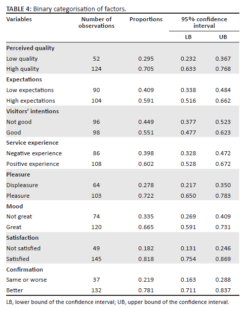 The proportions together with the 95% confidence interval (CI) for the different attributes of the service experience model were reported. The majority of respondents indicated that the service they received during their visit was of a high quality (70%, 95% CI: 63% - 77%). Furthermore, about 60% (95% CI: 52% - 66%) of the respondents had the intention to visit the museum in the future or recommend the museum to someone else, as well as share positive aspects of the centre with others. The expectations of most of the visitors about the Letaba Elephant Hall were high (60%). A positive trend or positive experience was also noticed, where over 60% (95% CI: 53% - 67%) of respondents had a great service experience at the museum. Overall, a high proportion of the respondents were entirely satisfied with their visit (81.8%; 95% CI: 75% - 87%). A total of 78% of the respondents indicated that their experience at the interpretation centre had in general been better or much better than they had expected; thus, their visit confirmed their expectations (see Table 4).
