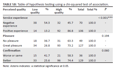 The proposed hypotheses for this study were tested using the Chi-square test of association, and all statistical tests were measured at a 5% level. Table 5 contains a two-way table summary of the results. From the collected data, we tested the hypothesis that expectations do not influence a service experience, where the null hypothesis was rejected, and results suggested that visitors' expectations strongly influence a service experience (p ≤ 0.001). Furthermore, it is also observed that quality that the visitors perceived has significantly influenced visitors' service experience (p < 0.001). The perceived quality statistically significantly affects visitors' satisfaction (p = 0.005). We observed that the higher the perceived quality, the more likely an individual is to be satisfied with the centre's visited.