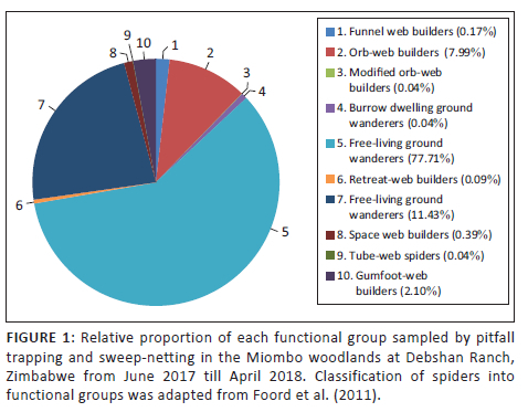 A total of 2328 spiders representing 25 families, 94 genera, and 166 species were recorded during the study (Table 1). The most species-rich families were Salticidae (33 spp.), followed by the Gnaphosidae (28 spp.) and Lycosidae (20 spp.), while eight families were represented by a single species (Table 2). Overall, pitfall traps accounted for 1857 (79.77%) individuals, and the ground-dwelling fauna was dominated by Salticidae (n = 703; 37.86%), Gnaphosidae (n = 494; 26.26%), and Lycosidae (n = 275; 14.81%) with the jumping spider, Stenaelurillus guttiger (Salticidae; 37.86%) being the dominant species. Sweep-nets accounted for 471 (20.23%) individuals, and the grass-dwelling fauna was dominated by Araneidae (n = 175; 37.58%), Salticidae (n = 136; 28.88%), and Thomisidae (n = 70; 14.86%) with Thyene thyenioides (Salticidae; 15.29%) being the dominant grass-dwelling species. The most abundant functional group was the free-living ground-dwellers (n = 1809, 77.71%), dominated by S. guttiger and Asemesthes paynteri (Gnaphosidae), followed by the free-living plant-dwellers (n = 266, 11.43%), which were dominated by T. thyenioides and Runcinia flavida (Thomisidae). The dominant web-building group was the orb-web builders (n = 186, 7.98%). The remaining functional groups were mostly different web-builders that together constituted less than 2.87% (n = 67) of the total spider fauna, individually contributing less than 2% (Figure 1).