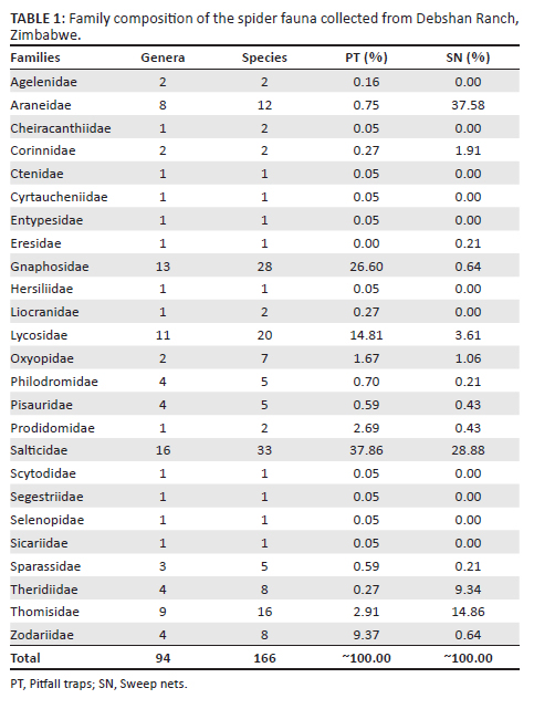 This study contributes to our knowledge of the geographical distribution of Zimbabwean spiders. The baseline information on the spider assemblages of Debshan Ranch provides a list of 166 species. However, in order to improve on the distributions and the diversity of the spider fauna, inventories should be conducted in all floral biomes in the country, using not only pitfall traps and sweep nets, but a variety of active search methods, that is, hand collecting, beating sheets amongst others. This will ensure that all spider taxa, including those in trees and bushes (left out in the sampling design of this study) are also included. This will allow researchers to determine the species that are endemic and threatened.