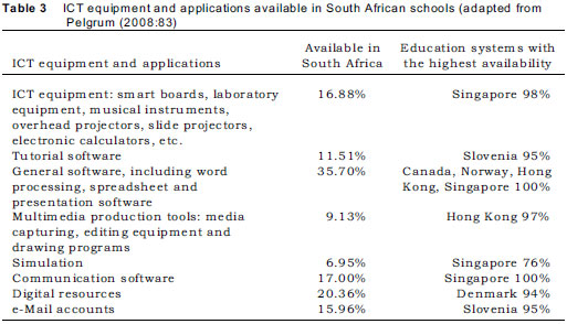 Table 3 lists South Africa's availability of ICT equipment and applications reported in SITES 2006 compared to some other participating countries and education systems. South Africa trails in terms of ICT equipment, tutorial software, general software, multimedia production tools, simulations, communication software, digital resources and e-mail accounts. The biggest contrasts in terms of ICT equipment and applications for all other education systems that participated in SITES 2006 are listed in Table 3. When compared to other developing countries, South Africa also performs poorly: South Africa reported only 17% ICT equipment available in schools compared to 47% ICT equipment available in Chilli, 70% in Israel, 72% in Lithuania, 98% in Singapore, 92% in Slovenia and 66% in Estonia (Pelgrum, 2008:80). These figures reflect the generally low and poor and unbalanced resources of South African schools, especially in rural areas. However, to meet the expectation of the e-Education White Paper of full ICT integration by 2013 (Pelgrum, 2008; Republic of South Africa, 2004), schools can only deliver through appropriate and sufficient infrastructure.