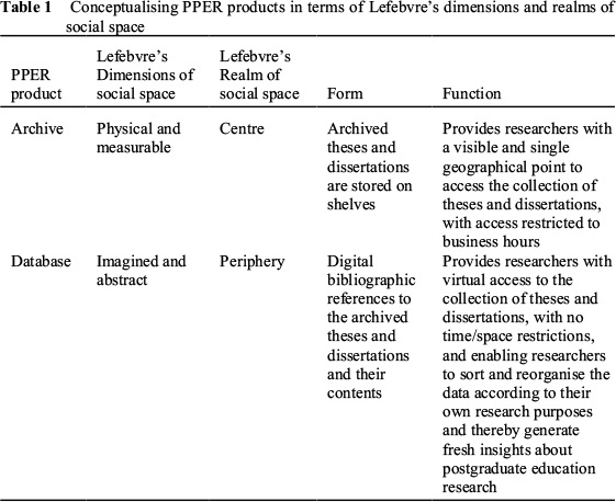 For their survey the PPER researchers visited 20 higher education institutions and photocopied and bound key sections of education theses and dissertations found in the libraries and departments of those institutions. In the Project these collected documents were housed together in a room known as the 'archive' and the contents of the documents were catalogued and classified electronically to form a bibliographic database. In this article we use Lefebvre's (1991) theory of space to reflect critically on three spaces which emerged over the course of the Project: the archive of physical documents, its virtual counterpart of the database, and the lived space when researchers use either the archive or database, or both.