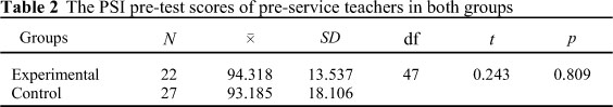 Related to the fourth research question, the values of the PSI pre-test-post-test mean scores and standard deviations for the pre-service teachers in both groups were calculated. The results are given in Table 7.