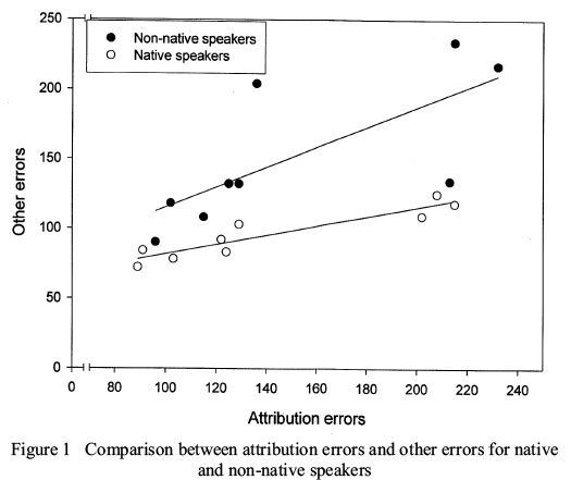 Figure 1 above indicates that as attribution errors increase, the other errors also increase for both native and non-native speakers of English. The steeper gradient in the corresponding rise of non-native speakers, viz. the native speakers is indicative of non-native speakers' greater propensity to the commission of both error groups than their native counterparts. Whereas the native speakers group was homogeneous in terms of their language, the non-native speakers belonged to diverse languages and had greater diversity in measures of exposure to, and experience with, the language than the native speakers. This possibly explains the greater degree of variance in their performance than their native speaker colleagues. Borg's (2000) study of an initial, non-assessed assignment written by 16 NS and NNS post-graduate students in education is instructive in relation to the present study's findings. His findings indicated that both NS and NNS speakers find conventions of incorporating source materials daunting. For non-native speakers, such problems were attributed to their language background which limited their proficiency in establishing textual voice.
