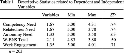 This research contains statistical procedures in order to predict work engagement in the Turkish universities. Therefore, in addition to descriptive analysis, pearson correlation and multiple regression analyses have been employed in the study. There are studies that employ pearson correlation and regression analyses in the education literature; among them are Grosser and Nel (2013) and Bukova-Güzel et al. (2013). The dependent variable of this study is work-engagement and the independent variable of the study is work-related basic need satisfaction with the subdimensions of "competency need", "relatedness need" and "autonomy need." The correlation between the variables was calculated by Pearson Correlation Coefficient. Multiple regression analysis was conducted to determine to what extent the independent variable predicted the dependent variable. Descriptive statistics were also used for the variables in the study. The scales do not have cut-off scores since the scales were not norm-referenced.