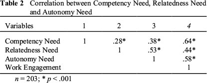It is clearly seen that that there is a significant and positive correlation (p < .001) among the four dimensions of the study. The highest correlation was obtained between competency need and work engagement (correlation coefficient (r) = .64) which implies that these two dimensions are positively associated at .001 significance level.