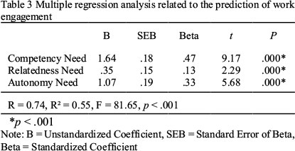 Multiple regression analysis was conducted to determine to what extent work-related basic need satisfaction with the subdimesions of competency need, relatedness need and autonomy need predict work engagement. Looking at the Table 3, it can be seen that the sub-dimensions of the work-related basic need satisfaction are significant predictors of work engagement R = 0.74, R2 = 0.55, Analysis of Variance (F) = 81.65, p < .001). When the relationships of the variables with work-engagement were evaluated one by one, it was seen that the "competency need" was the highest meaningful predictor of work engagement (β = .47; p = .000). The second highest meaningful predictor of work engagement was "autonomy need" (β = .33; p = .000). The lowest meaningful predictor of work engagement was found to be "relatedness need" (β = .13; p = .000). These results reveal that variation in the related dimensions of Table 3 explain 55% of variation in the work engagement. The cut-off criteria for determining the extent to which there is a multi-collinearity between the predictor factors utilized in regression analysis was related to the poor discriminant validity (Brown, 2006). The evidence, which signifies whether there is a poor discrimination between the predictor factors is that the correlations between the predictor factors must not exceed the determined cutoff point of .85 (Brown, 2006; Kline, 2005). In the present study, the correlations between the predictor factors are found to be below the cutoff point of .85 (see Table 2). This shows that there is no multi-collinearity between the predictor factors.
