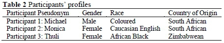 A non-probability purposive sample of three par-ticipants was used. All three had gone through a full career assessment and guidance process at the research site. These learners were then approached for possible participation in this research study. The average age of the learners was 17 years. They all met the criteria of being Grade 11 adolescent learners, and all had a Facebook Profile for more than two years and were willing to participate in the research. The research site was a private school situated in the Northern suburbs of Johannesburg, consisting of families who fall in the middle-to-high income bracket. The language of teaching and learning at school was English, and although par-ticipants' home language was not English, they communicated in English both at school and at home. The school's headmaster acted as the gate-keeper, and parents' consent and learners' assent was requested. Of the three participants, one was male, and two were female. Although one of the participants was not of South African origin (Table 2), at the time of the study, she was living in Johannesburg and attended the high school in which the research was conducted.