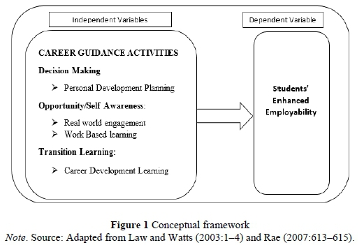 For the purpose of this study, career guidance comprises planned activities designed by the university to facilitate the development of self-awareness, opportunity awareness, decision learn-ing and transition learning in students, as identified by the DOTS model developed by Law and Watts (2003). While employability is defined as the ab-ility of undergraduates to possess and exhibit the skills, knowledge, attributes and attitudes not only to secure a first job or start a business, but also to remain employable throughout life (Dacre Pool & Sewell, 2007; Pitan, 2016b; Watts, 2006).