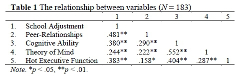 Correlations between the variables are presented in Table 1. School adjustment was positively correlated with peer relationships (r = .481, p < .01), cognitive ability (r =. 380, p < .01), ToM (r = .244, p < .01) and hot EF (r = .383, p < .01) (see Table 1).