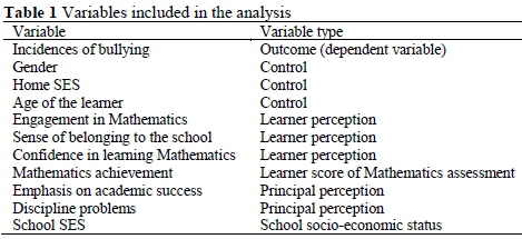 Following the work of Finn (1989), Mullis et al. (2012) and Shaw and McKay (1942), we take into account principal and learner perceptions of school climate as well as the SES of the school as factors that contribute to incidences of bullying in schools. School climate is defined as the intangible factors that make up the health of the schooling environment (Mullis et al., 2012). A school with a healthy climate is characterised by safety and orderliness, and high emphasis on academic success. Learners feel as though they belong to the school, they have confidence in their ability and are engaged within the classroom. As a result, a healthy school climate is characterised by low levels of bullying within the school (Finn, 1989; Mullis et al., 2012; Shaw & McKay, 1942).