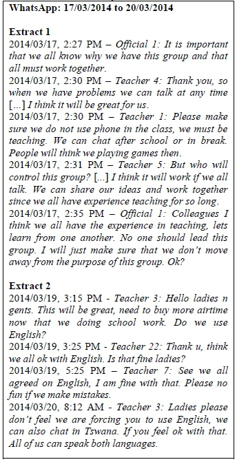 The data used in this paper was extracted from the teachers' VCoP (WhatsApp) conversations. These conversations were exported into MS Word, saved on the HSRC's secured shared drive and backed up on an external drive.