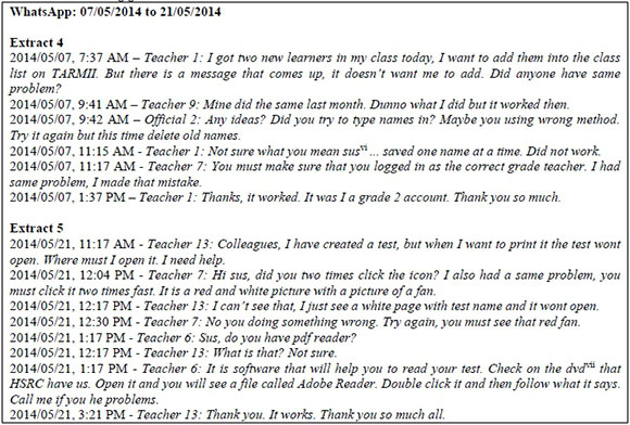 With the formation of the VCoP, members need to address common problems or concerns through a collective approach that results in specific and deliberate discourse and action. In Extract 4, Teacher 1 experiences a problem with adding new learners onto her existing class list. Teacher 9, Official 2 and Teacher 7 attempt to assist by suggesting possible action that could be taken. Teacher 7 then acknowledges that she made the same error earlier and suggests a simple solution. Later in the day, Teacher 1 reports back to confirm having overcome the issue. In Extract 5 we see that Teacher 13 is not able to print the PDF version of the test. Teachers 7 and 6 both offer assistance. Teacher 6 starts off by trying to locate the error and then leads Teacher 13 to the solution, which is found on the software installer DVD. Both Extract 4 and 5 show how the teachers, as a collective of the VCoP, assisted with solving problem.