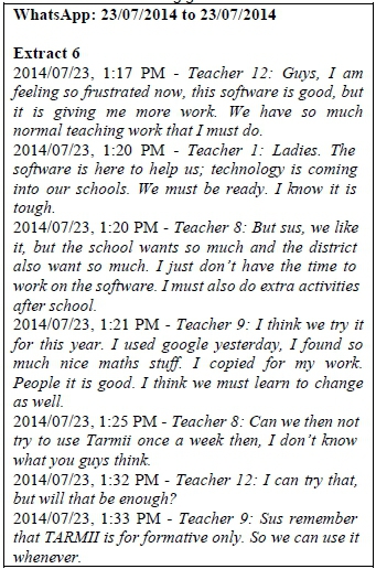 Teachers who attended the TPD programme were supposed to receive a series of school-based monitoring and support visits conducted by the NW officials. The ICT based training programme attended by teachers was successful. However, initiating and sustaining the monitoring and support component was problematic. This was due to the fact that officials had to travel vast distances to monitor and support individual teachers. As a result, only few teachers were monitored and supported in the first month. Teachers who were initially excited about using the software now felt isolated, with no support from the officials. In an attempt to address this problem, the teachers and officials from District B created a WhatsApp group, the formation of which was not part of the TARMIIfp research design, but proved critical in the context of the problem.
