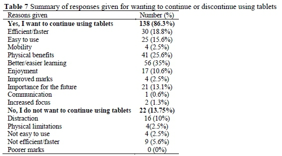 The reasons for learners wanting to continue or discontinue using tablets were also explored through content analysis. The results, as shown in Table 7, indicate that the majority of learners (86.3%) were in favour of continuing the use of tablets at school. The most common response given by learners was that tablets were better or easier to learn from. Learners indicated that they used the school portal to get information, watched videos when they did not understand a concept, and took photos/videos of the teacher explaining difficult concepts to watch again later.