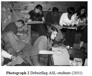 The first two-day visit is aimed at educational psychology group assessment, and the second at educational psychology group-therapeutic intervention. Grade 9 clients self-select their groups. Photograph 9 shows how students work outdoors with clients in groups scattered around the school grounds. Depending on the enrolment size per year, the sizes of client groups varied between 8 and 12 members. The two visits take place four months apart to afford each ASL-student the opportunity to score and interpret their group of clients' assessment media, and prepare for feedback and therapy. Psychometric measures and therapeutic techniques are mostly not standardised for use with the particular demographic group at the school and ASL-students use constructivist and postmodern techniques to provide services to clients. Based on the outcome of the assessment visit, each psychology student decides on a challenge to address therapeutically with their group during the second visit (Photograph 10).