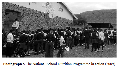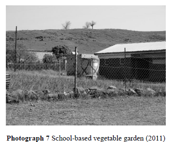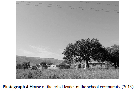 The remote schools are located in the province of Mpumalanga on the border between South Africa and Swaziland. The setting is characterised by agriculture and traditional cultural structures (see Photograph 4 showing the home of the local tribal leader). As is evident in Photograph 5, children receive food daily as part of a national nutrition programme (Department of Education [DoE], 1994). Photograph 6 shows the gravel road leading towards the mountains where the schools are situated. Photograph 7 shows a school-based vegetable garden to supplement feeding, and an AIDS-ribbon signifies the prominence of the pandemic in the daily lives at schools. siSwati is the home language of most of the students and teachers at the school. English is the language of teaching and learning (DoE, 1997).