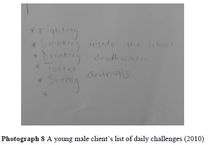 ASL-students provide educational psychology services to Grade 9 learners at the end of an educational phase in which learners are required to choose subjects for the remainder of their schooling. The number of enrolled Grade 9 learners at the rural school has varied between 120 and 80 learners during the decade of the FLY-partnership, and ages have varied between thirteen and twenty-one years. The trauma of being hungry and sad, not always having parents with him, yet just being a young person who enjoys friendship and relaxation, is evident from the list of daily challenges experienced by one young man (Photograph 8).