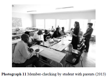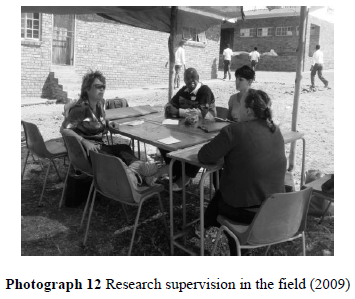 In FLY educational psychology research students build evidence-based knowledge on resilience in a rural school context (including professional development of teachers). FLY-research students collect data by observing the context, interviewing young people or teachers according to research foci, implementing an intervention in some cases, and returning to validate results with participants. Photographs 11 and 12 show how research students use time at the rural school for data collection (observations, interviews, and questionnaires), consultation with supervisors, and member checking of results with participants. Data on student-related experiences of work engagement and student burnout includes retrospective experiences of educational psychology research students who were immersed in a context of severe challenges in a rural school. Educational psychology research students work within an education system at risk in parallel with professionals such as teachers and educational psychologists - and experiences of work engagement during their fieldwork could arguable prepare and buffer them for future occupational burnout.