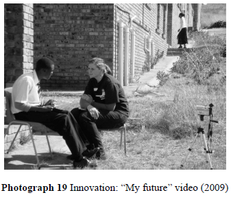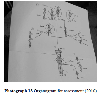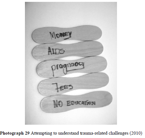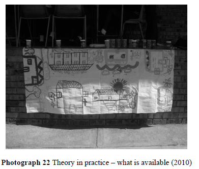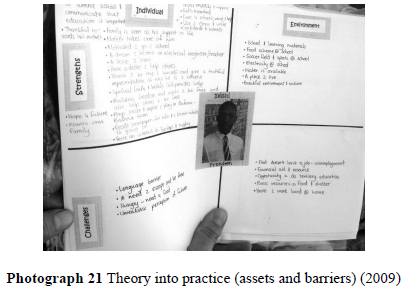 Photographs 17 to 22 show student innovations that enabled the development of professional self-esteem. In the absence of standardised psychometric instruments to assess and provide therapy with the particular client population, students had to develop assessment methods. These assessments had to accommodate multilingualism, limited literacy levels, and had to enable expression and projection of diverse cultural and contextual resources, risks and aspirations. Photographs 20 to 22 show how students used theory on resilience to develop psychological techniques.