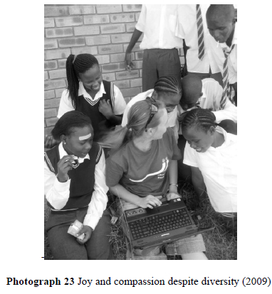 In many instances former students expressed that their training in a challenging educational setting enabled them to be committed in educational psychology careers in diverse and adverse ecologies (synonymous with Africa). Photographs 23 and 24 and the following extract show the awareness that diversity, and in particular its multilingualism, does not necessarily imply distress: