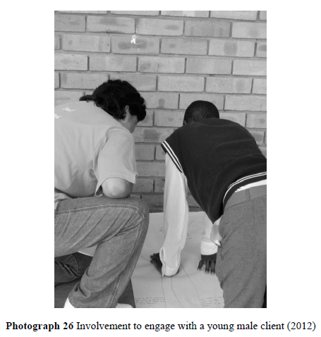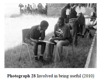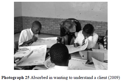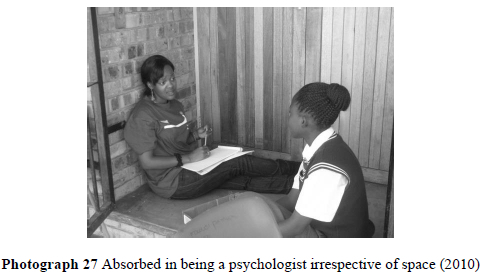 Participants recalled capacity for professional efficacy acquired during their training. Their absorption and involvement in providing service as educational psychologist are apparent in Photographs 25 and 26. Their reported effectiveness included a range of competences required to be an educational psychology professional for a diverse client base: