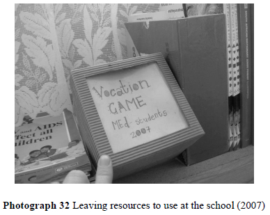 Less time was spent with clients in the rural school than with clients in the city. The university-based training follows a one-on-one training model with days spent on individual assessment, feedback to the client and their family, and then additional days for therapeutic intervention. The participants were aware of the high need caused by resource constraints (Photograph 31), and the absence of psychology services in the isolated school (Photograph 32). The limited time at the rural school appeared to have caused participants concern. They were unfamiliar with group-based work over short periods. They were worried that the limited time of educational psychology services would be sufficiently useful to clients: