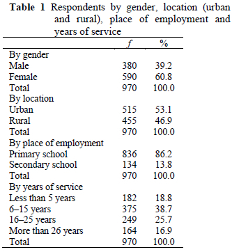 The research was conducted during the 2014/2015 and 2015/2016 school years. The sample was random. The survey resulted in 970 correctly completed questionnaires. The respondents were of different gender, had varied experience, were not employed at the same schools nor lived in the same places, and taught different subjects. The research was conducted in urban and rural environments throughout the Republic of Serbia and participants voluntarily agreed to participate in the study.