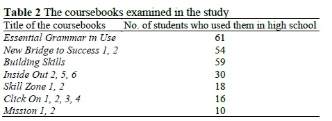 Our aim with the quantitative analysis of the questionnaire data was to identify the commonly employed coursebooks in Turkish high schools. After the analysis of the questionnaire data, the 15 most frequently employed EFL coursebooks in Turkish high schools were identified and examined (Table 2). Our analysis focused on the books used in Turkish high schools because the university entrance exam is based on the curriculum and materials covered in Turkish high schools and determines to which universities and departments students are accepted (Hatipoğlu, 2010, 2013, 2016, 2017).