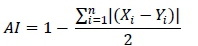 The term, , in Porter's equation is the sum total of the absolute differences matrix. No established criteria existed to determine the strength of the AI since the calculation of the AI is dependent on the size of the ratio matrix (number of categories) and the number of content items classified (Fulmer, 2011:386). Fulmer developed a computational algorithm to calculate simulated mean critical values based on varying the number of topics, cognitive demand levels, and curriculum content items.