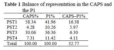 The data in Table 1 shows that the relative frequency of the CAPS content items was greater than the relative frequency of the P1 assessment items by 16.38% only for items based on PST1. For the remaining topics, the relative frequency of the CAPS content items was less than the relative frequency of the P1 assessment items by an average of 5.46%. The PST absolute value of the difference between the relative frequencies of the CAPS and the relative frequencies of P1 was 32.77% and indicate a balance of representation of 67.23% (100% - 32.77%) between the CAPS and P1.