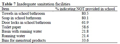 Facilities were also, in many instances, inadequate as indicated in Table 7. One in five young women (21.4%) indicated that they did not have access to running water. One third (33.6%) reported experiencing challenges in disposing of menstrual products; almost two-thirds (61.9%) indicated that they could lock doors when needing privacy. Just over 80% of young women reported experiencing at least two challenges in the form of lack of soap and towels.