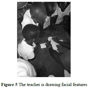 In Figure 5 the children suggested that the teacher create human facial features such as nose, eyes and mouth. The teacher had not planned to draw those features, she only agreed to do so when the children insisted that a human being must have such features.