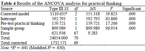 Referring to Table 4, the results of the ANCOVA test showed that the sample group's independent variables had a significant effect on the dependent variable for the post-test on practical thinking skills (F(1,67) = 96.954, p < .05). In addition, the pre-test control variables had a significant effect on the dependent variable for the post-test on practical thinking skill (F(1,67) = 17.206, p < .05). As a result, we rejected the null hypothesis. The comparative test results of the practical thinking skill for both the control and experimental groups showed that there was a difference between the two pairs of comparisons which was significant after controlling Type I errors using the Bonfferoni method. Both the experimental and control groups obtained significant results (the difference in the mean of the post-test on practical thinking skill = 7.3715, p <.05).