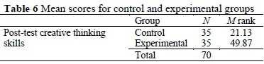 Referring to Table 6, the mean score for the control group was 21.13 and for the experimental group, 49.87. These results show an increase and significant differences in the experimental group's scores.