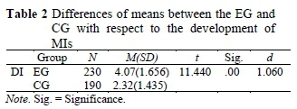 With regard to the second objective, Table 2 shows that students at the EG school had partially or completely developed an average of four intelligences whereas CG students had developed an average of two. In addition, a large effect size was shown, determining that the standard deviation of difference between the two groups was high.